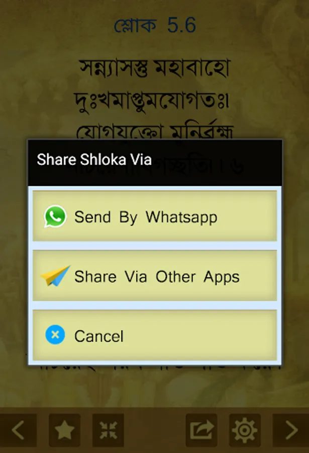 You can share the verse from Bhagavad Gita Bangla with your friends using any of your favourite app like whatsapp, Facebook, Google+, etc; Just go to Verse Page and tap the send icon(See Screenshot) at the bottom panel to choose apps for sharing