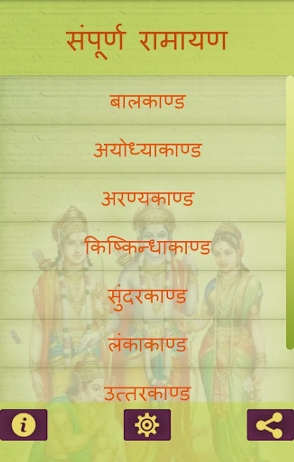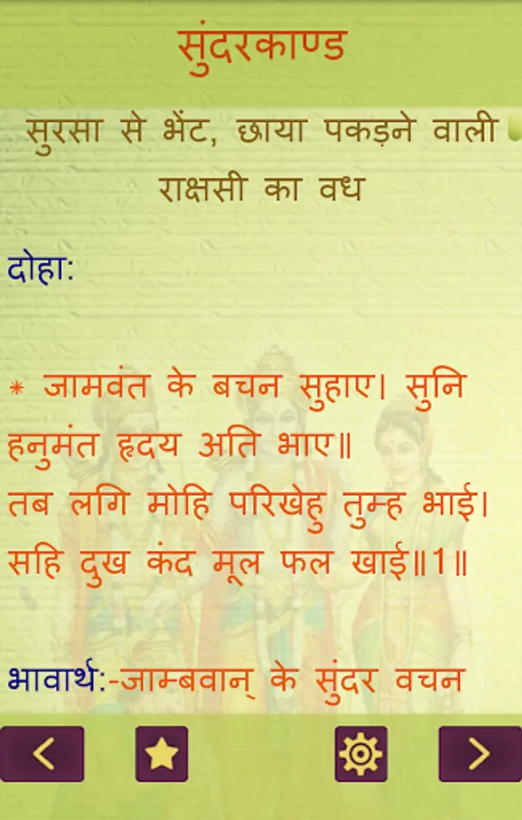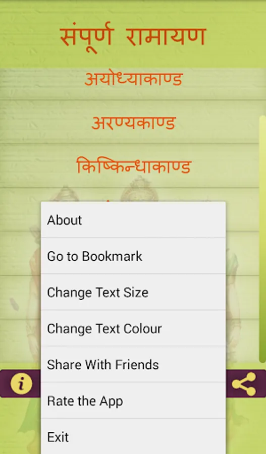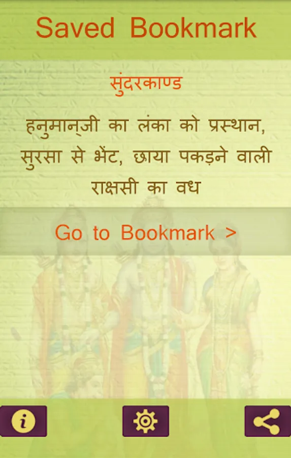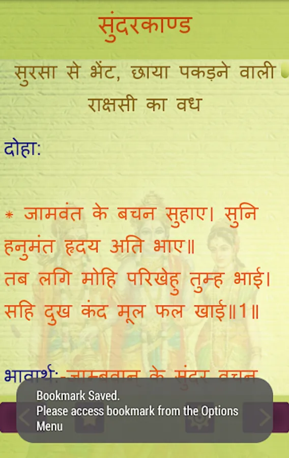 This App supports bookmarks. Forgot from where you left reading? Now you can resume reading Shri Ramacharitmanas from the point where you left. Just press the star icon[see screenshot] on the Doha Page and the Page will be bookmarked. You can resume reading by selecting "Go to Bookmark" option from the Options Menu.