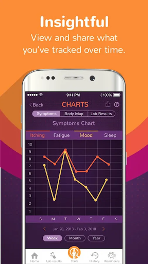 - Charts to view your symptom history and liver marker levels over time