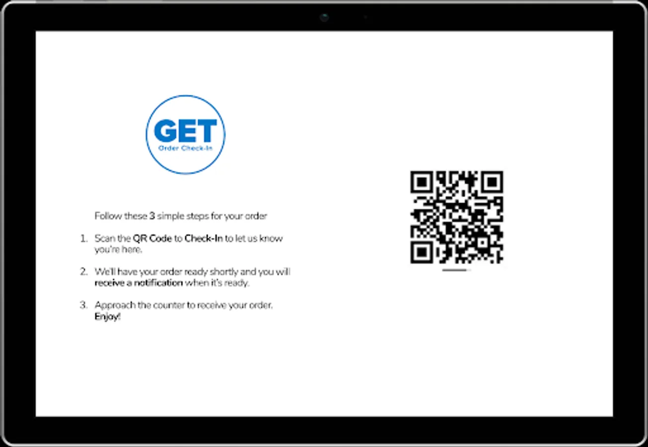 GET Order Check-In is an auxiliary app for online food orders for pickup. A customer will place an order in GET and then arrive to the restaurant for order pickup. The merchant will display the app for customers to check in manually upon arrival if location services is not enabled on their device. Using a rear-facing camera, the customer will scan a rotating QR code in the app to check in, which alerts the merchant to start the order/preparation process. This app only works for authorized GET merchants and requires local admin access to set up.