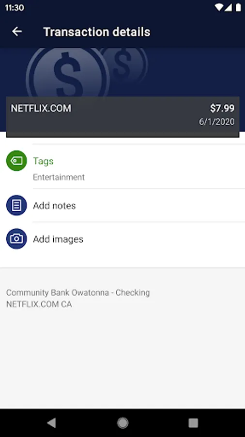 Add Tags, Notes, Images & Geo-Information: By enhancing transactions with custom tags, notes or photos of a receipt or check, you have the ability to stay organized and find exactly what you’re looking for when searching through your finances.