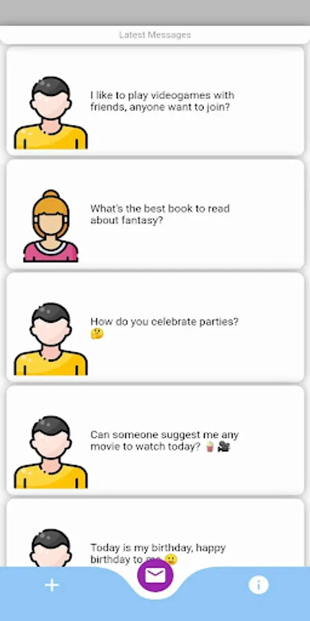 Be part of a dynamic list of messages posted by people and interact with them🎉. Let others know what you think🤔 about a topic and create a list of comments by users around the world. Be anonymous with free chat online, have random chats, meet new people, make new friends and reply to strangers.
