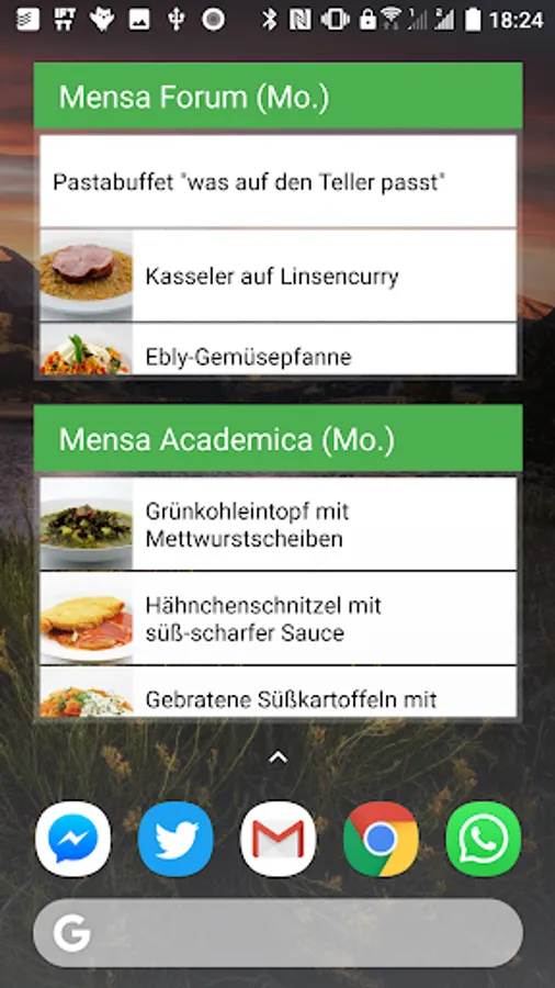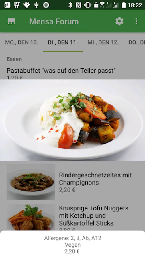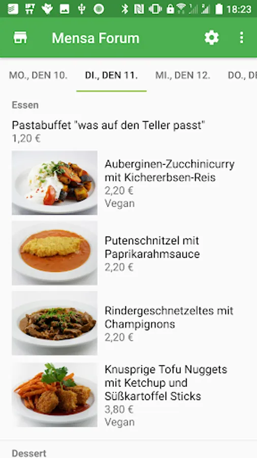 The menus can be retrieved one week in advance, are grouped by the restaurants (Mensa Academica, Mensa Forum, ...) and sorted by the type of dish (main dish, soup, ...). Conveniently, the best-priced dishes are shown right at the top of the list.