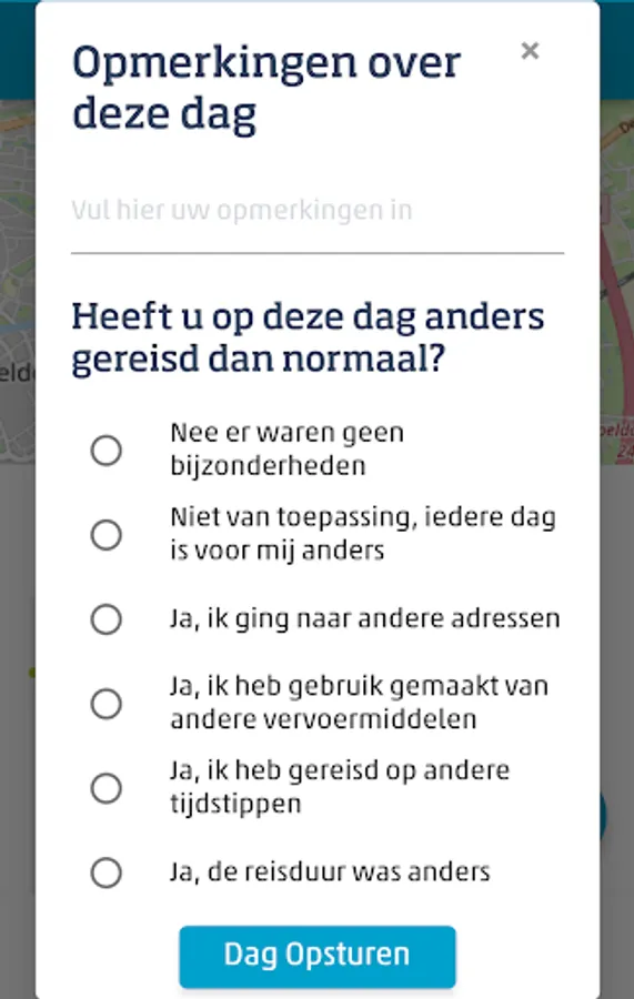 The study on the road in the Netherlands (ODiN), which Statistics Netherlands is carrying out on behalf of the Ministry of Infrastructure and Water Management, aims to collect information about the way in which we travel. This information is indispensable for the development of traffic and transport policy, such as improving public transport, road safety and traffic congestion. To participate in this survey, the user must have received an invitation and log in with the attached login details.