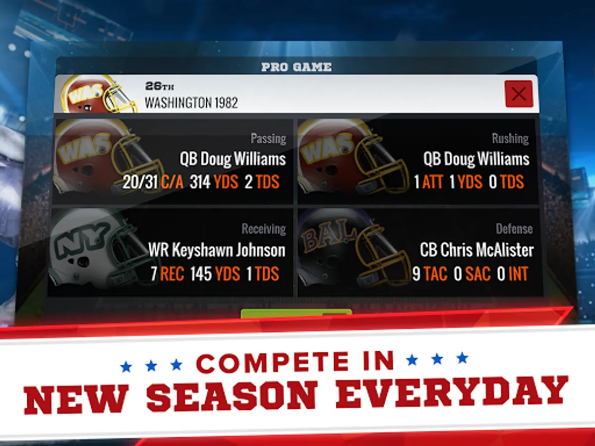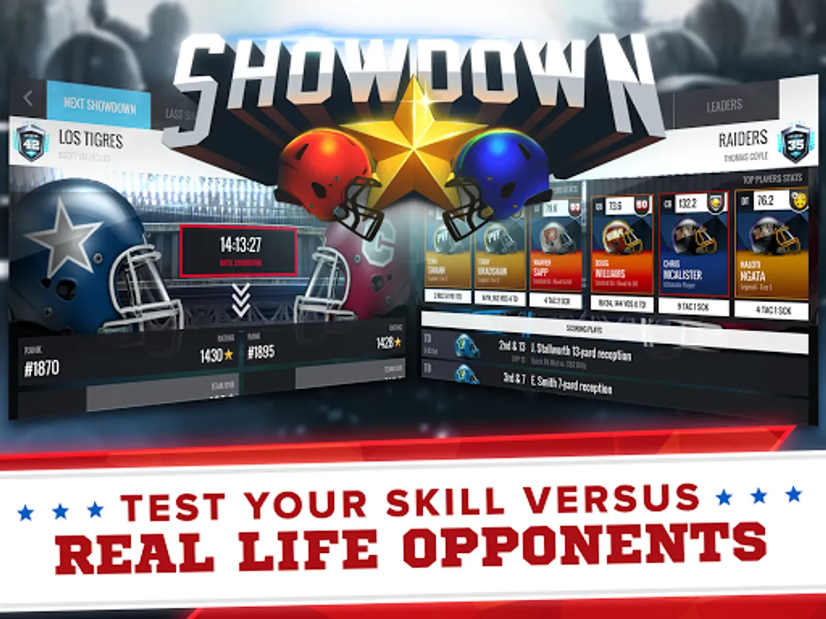 Daily Showdowns give your franchise a chance to compete in head-to-head games against other GMs in real-time. Scout opposing players, adjust your playbook, and win! Climb the Showdown leaderboard and become an elite pro football team!