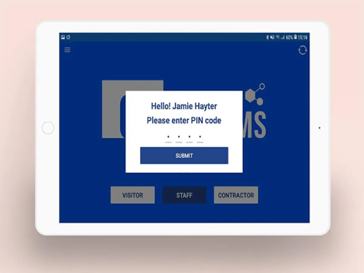 It is usually a fixed point kiosk at the entry of the site, SMS , email notification will be sent to the selected company staff when a visitor did the registration.