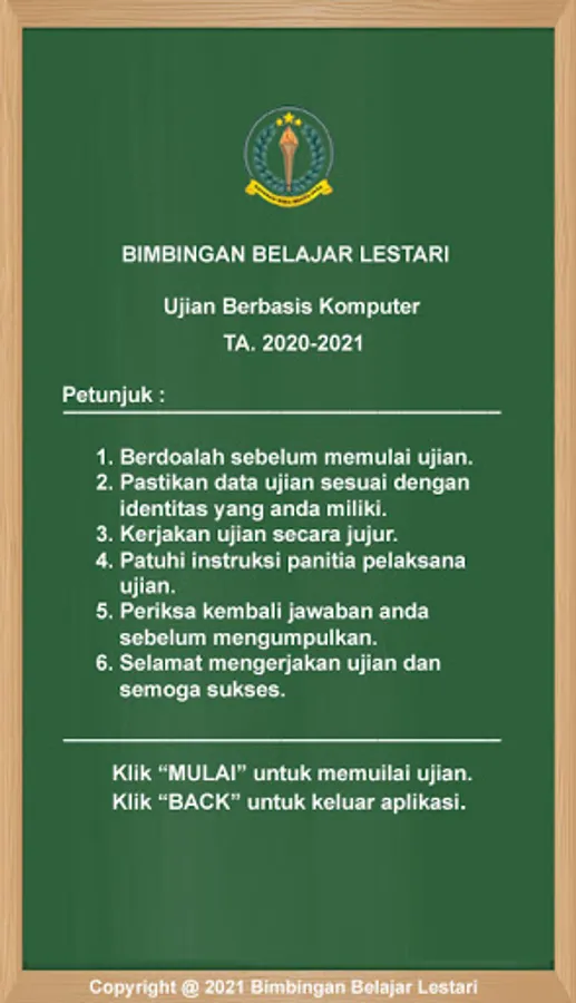 Lestari Tutoring is the official exambrowser application for CBT with the Sustainable Tutoring license. The aim is to facilitate the learning evaluation process. In addition, this application is made so that teachers and students can easily access the exam portal page and are provided with a good level of data transition security.