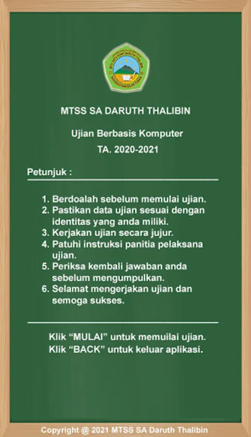 MTSS SA Daruth Thalibin is the official exambrowser application for CBT licensed by MTSS SA Daruth Thalibin. The aim is to facilitate the learning evaluation process. In addition, this application is made so that teachers and students can easily access the exam portal page and are provided with a good level of data transition security.