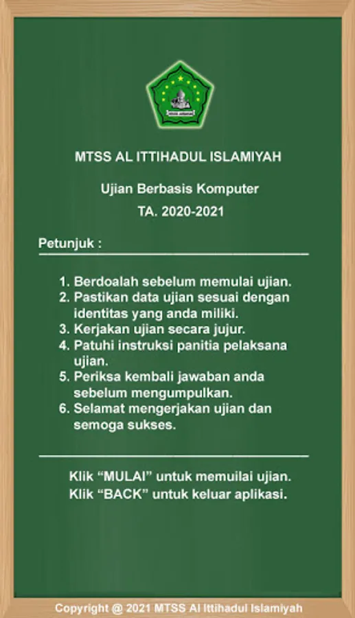 MTSS Al Ittihadul Islamiyah is the official exambrowser application for CBT licensed by MTSS Al Ittihadul Islamiyah. The aim is to facilitate the learning evaluation process. In addition, this application is made so that teachers and students can easily access the exam portal page and are provided with a good level of data transition security.