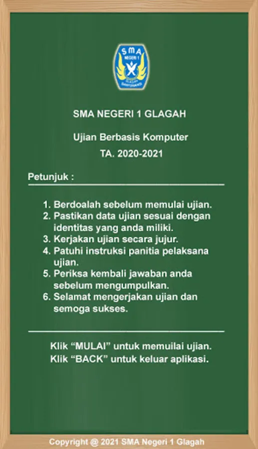 SMA Negeri 1 Glagah is the official exambrowser application for CBT licensed by SMA Negeri 1 Glagah. The aim is to facilitate the learning evaluation process. In addition, this application is made so that teachers and students can easily access the exam portal page and are provided with a good level of data transition security.