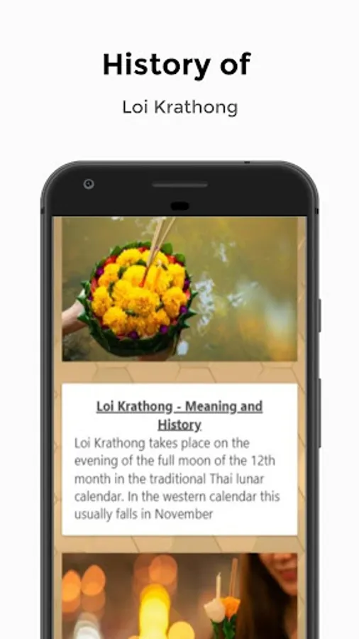 Loi Krathong takes place on the evening of the full moon of the 12th month in the traditional Thai lunar calendar. “Loi” literally means 'to float,' while Krathong refers to the lotus-shaped receptacle which can float on the water.