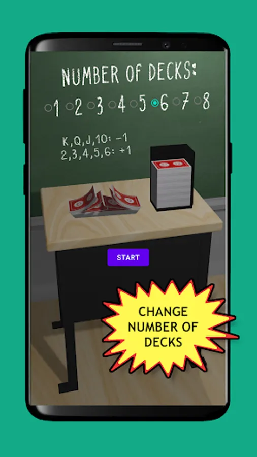 Efficiently train at card counting while playing blackjack. The features of this app are designed to allow you to easily learn to keep the running count and convert it to the true count based on the number of decks remaining in the shoe.
