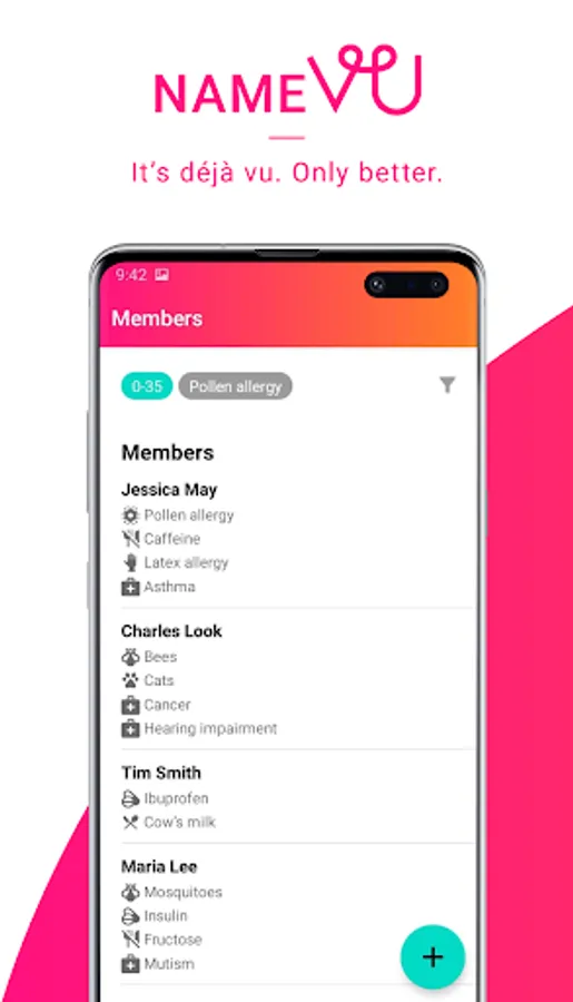 With NameVu, you can instantly add new members to your list, select their birthdays, add notes of whatever you think is worth remembering and choose their allergies, intolerances, and other conditions so that you'll be prepared for any situation. Find and sort your members quickly and easily by applying any combination of the filters offered.