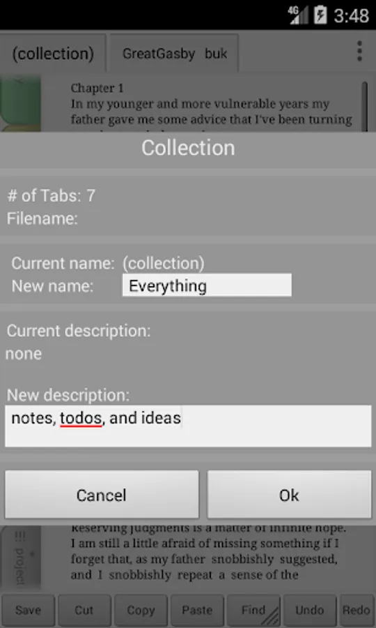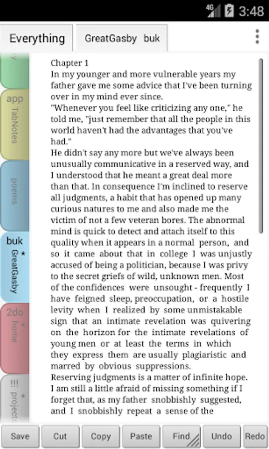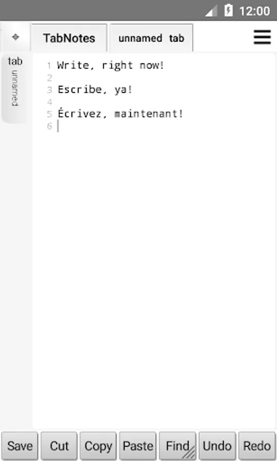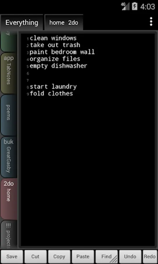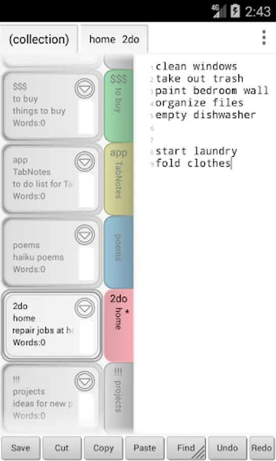 Write simple text notes and keep them organized with a list of labeled vertical tabs. Quickly switch between notes by pressing the desired tab - no loading files or navigating sub menus. Customize each note with a unique font, font size, line numbers, and tab color. Basic editing tools include undo, cut, copy, paste, and find. Notes are saved as a collection in an XML file for access in other applications or individual notes can be exported (or imported) as text files or shared with other apps. Tabs can be added, deleted, and renamed. Tabs can also be reorganized by simple drag and drop. Two color themes are available, white and black.