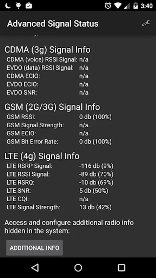► Easy to read 3G and 4G statistics in percentages based on the max/min values instead of just decibels.
