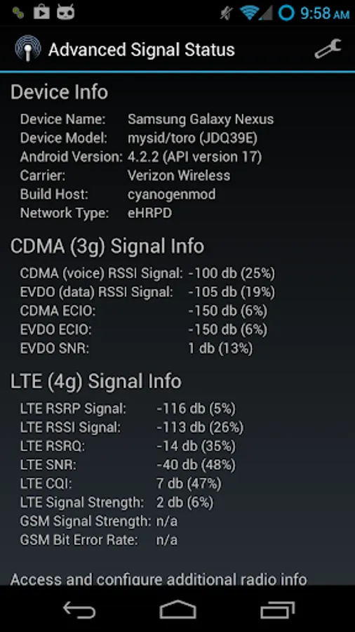 Use the info contained in this app to monitor your current signal and find dead spots around your home and office. Also useful for complaining to tier 2 tech support with your carrier when your signal sucks. Be informed and use what they know to your advantage!