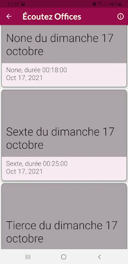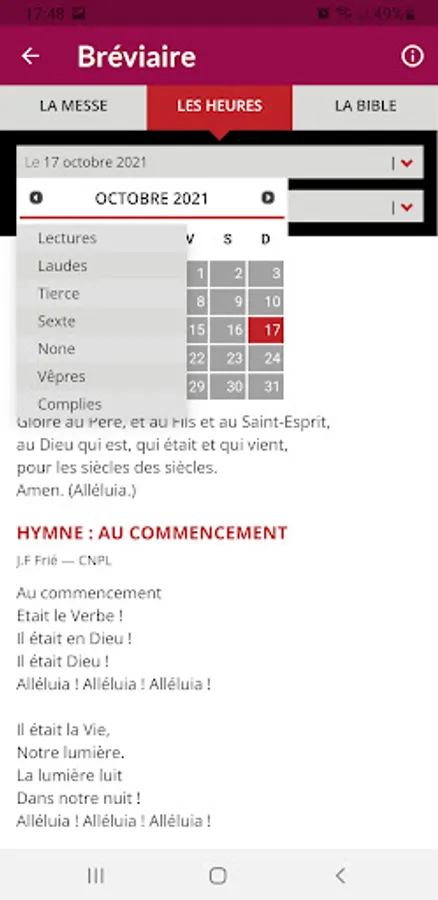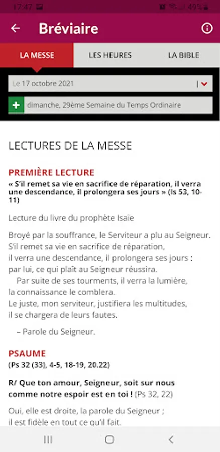 The fourth section is in English with daily readings from the holy bible. In the Listen to Offices section, you can listen to the Catholic Breviary in French for free.