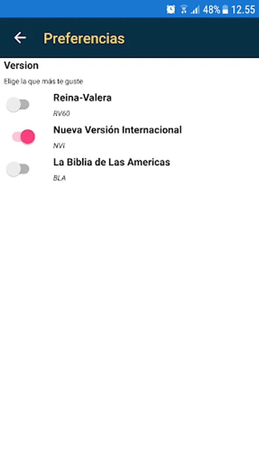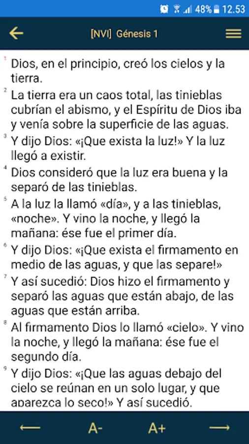 Bible Spanish Reina Valeria version, New International Version and New American Standard Bible.