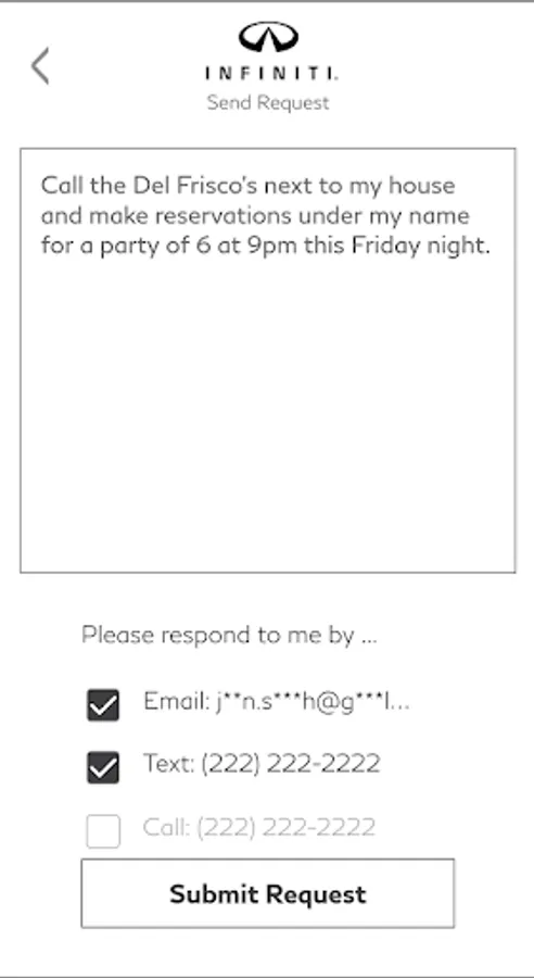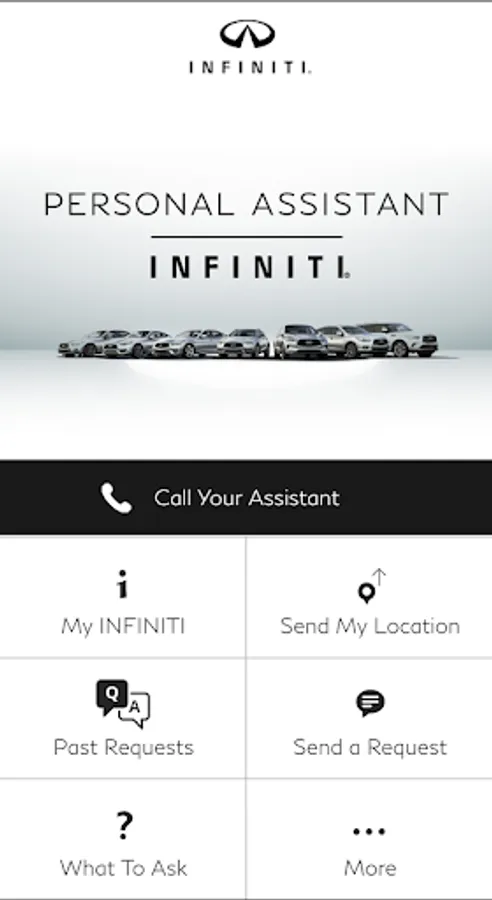 The INFINITI Personal Assistant app provides registered users of the INFINITI Personal Assistant service with expanded access to a world-class team of professional assistants. The mobile app gives registered users the ability to make requests and optionally submit their geolocation from anywhere in the world via a cellular or data connection. Registered users also have instant access to their past requests and the corresponding Personal Assistant responses.