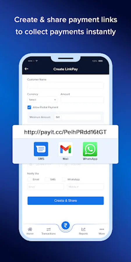 Create & share payment links with customers via SMS, Email or WhatsApp & receive payments immediately with just a single click!