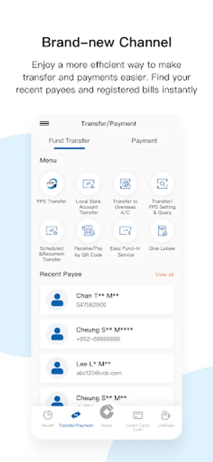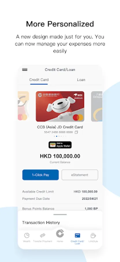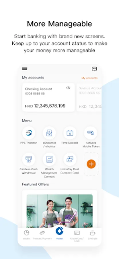 - Enhanced bottom navigation menu with brand-new five channels (including Home, Transfer/Payments, Credit Card/Loans, Wealth, and Lifestyle) to make your banking experience more flexible and suitable