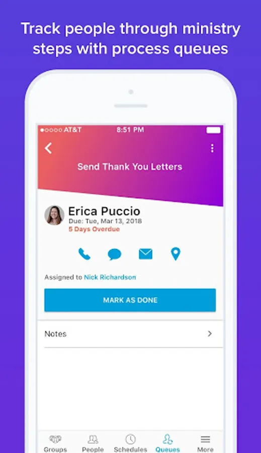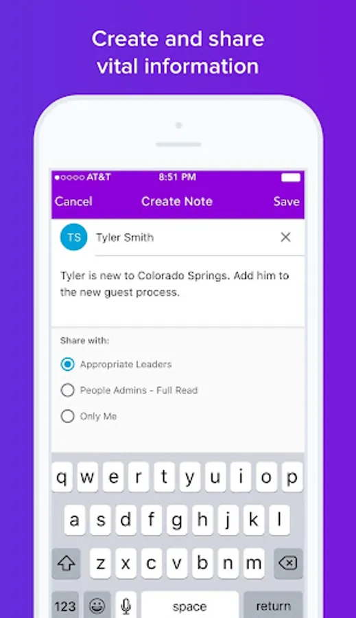 • Use Notes to share and view vital information among ministry leaders, keeping all of that important context in one place to tell a person's story