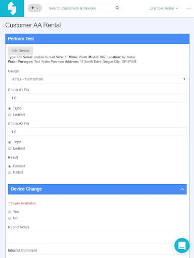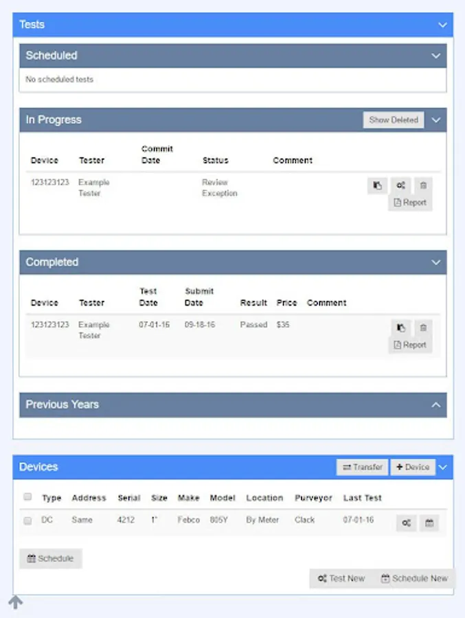 -Search for customers via name, address, device type, water district, or last test date with our handy filters