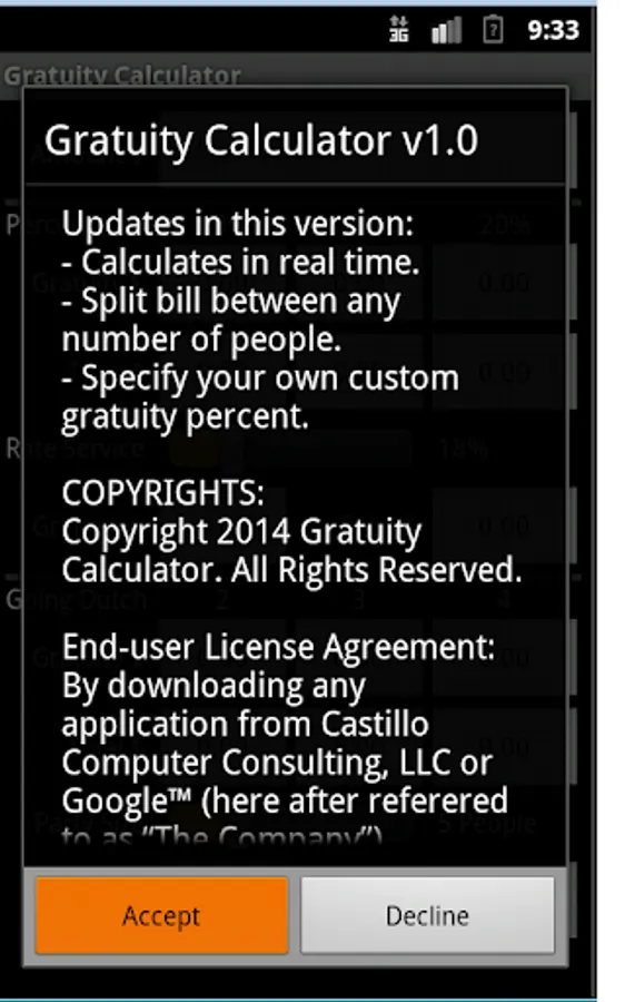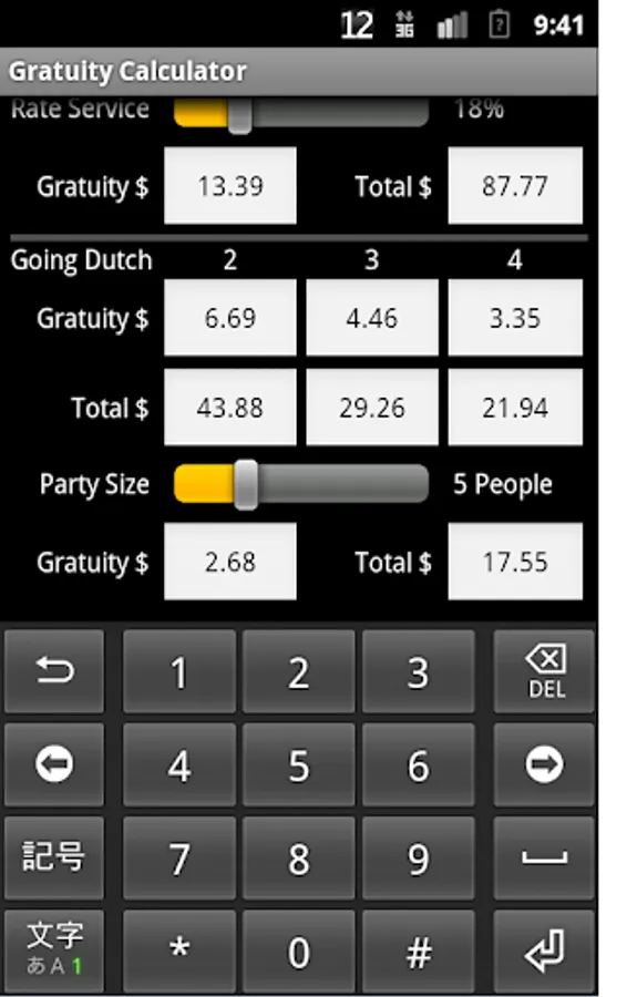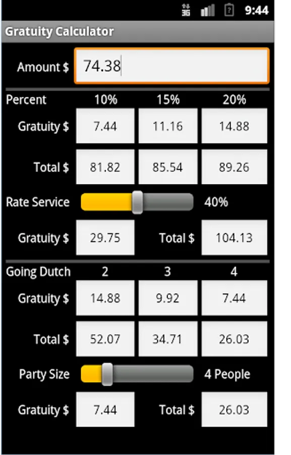 The Gratuity Calculator will even split your bill making it very simple to figure out what each person in your party owes in case your party or group decide to go Dutch.