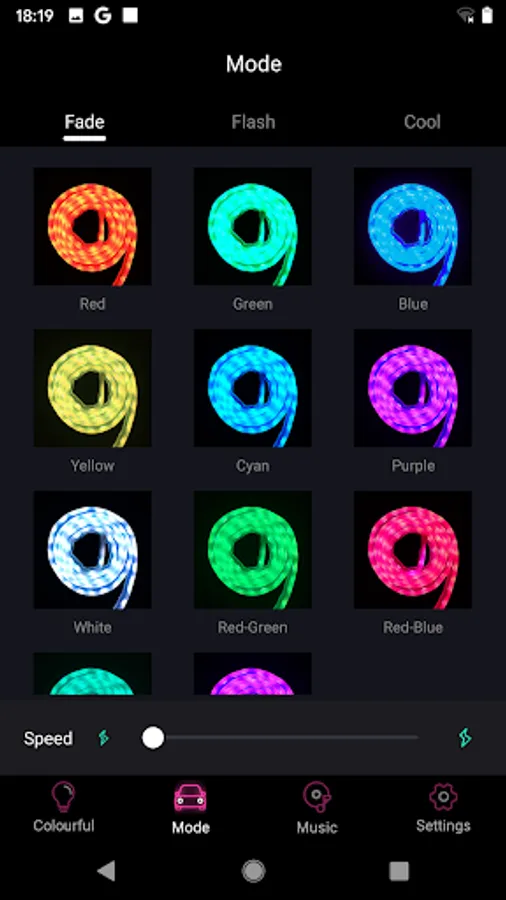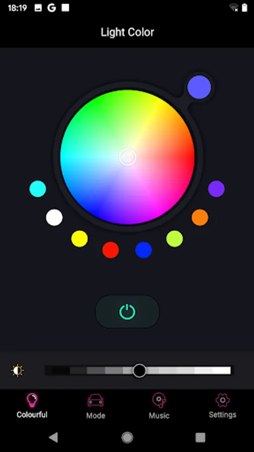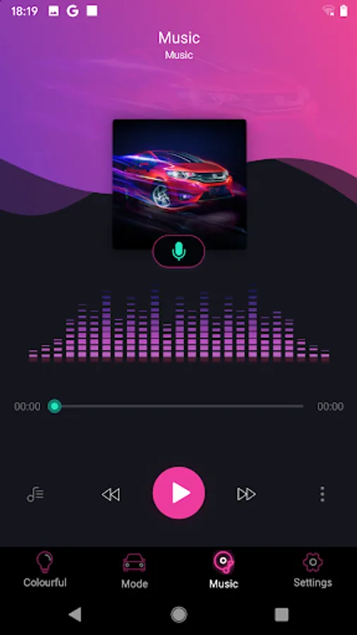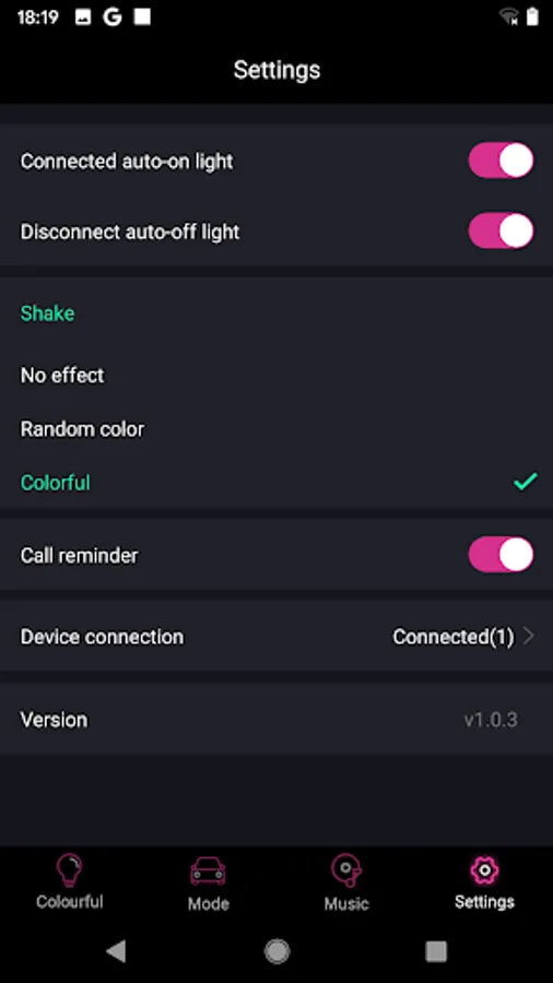 A car color control app, which can control the LED lights on the car through the mobile phone app. It can either manually select the color change mode, or automatically change with the music rhythm. It supports the functions of local music import, color change by shaking and call reminder