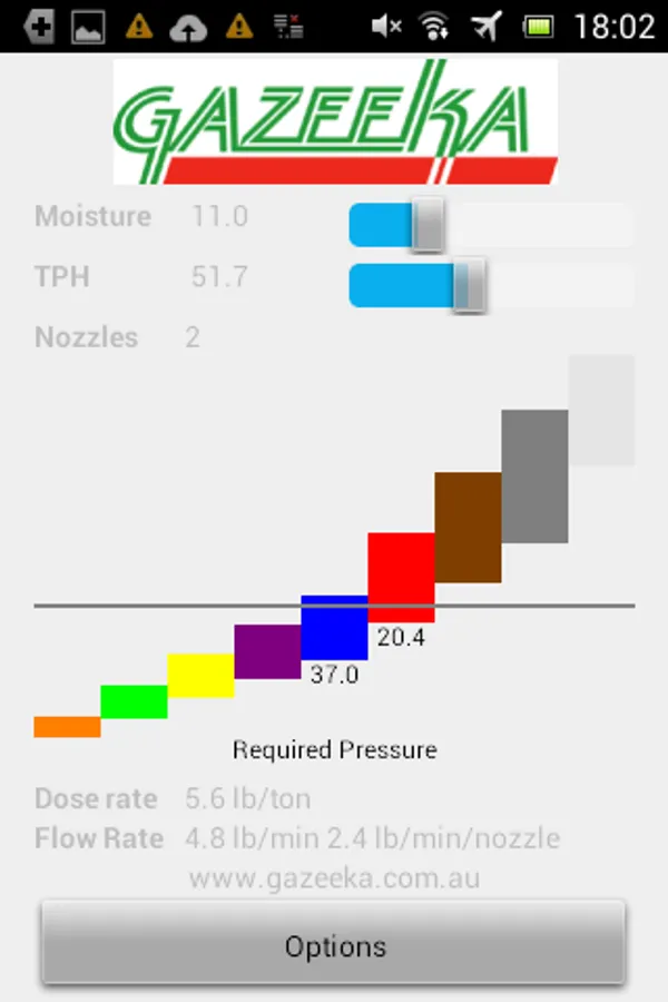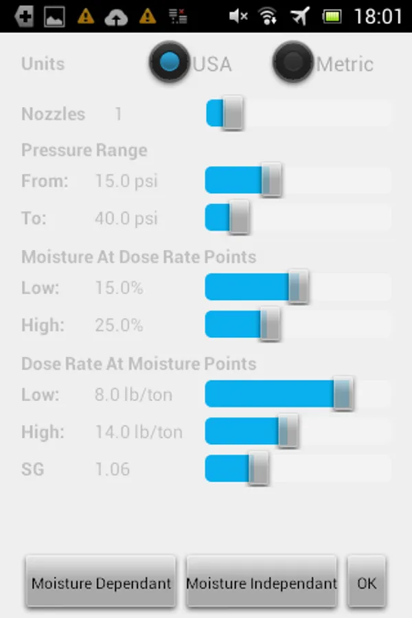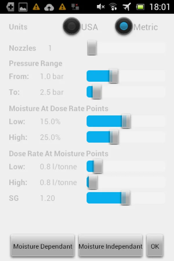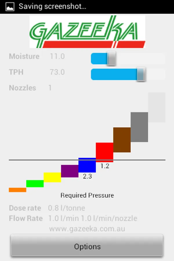 This application would typically be used by hay baler operators who add a liquid preservative to their hay at the pickup section of their hay baler. The App is designed to provide the hay baler operator with what size nozzle (determined internationally by the color) and at what pressure to operate that color nozzle(s) to accurately add the correct amount of preservative. The information about the operating condition and dose rate entered into the Application's options screen and the moisture and tons per hour (TPH) in the main screen will determine the nozzle color and pressure.