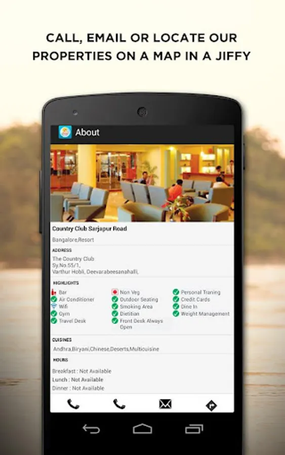 The Country Club mobile application allows users to browse and locate updated Country Club properties (Resorts, Hotels, Clubs and Fitness centers) all across the globe. Users have convenient buttons to call, email or look up properties on a map. Users can also view available resort photos as well.