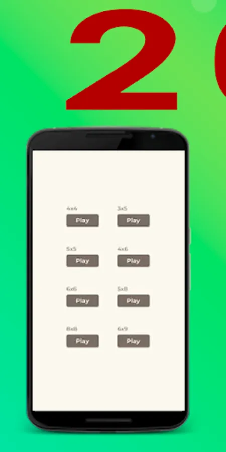 - Various board sizes for the game: 4x4, 5x5, 6x6, 8x8, 3x5, 4x6, 5x8, 6x9