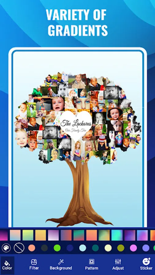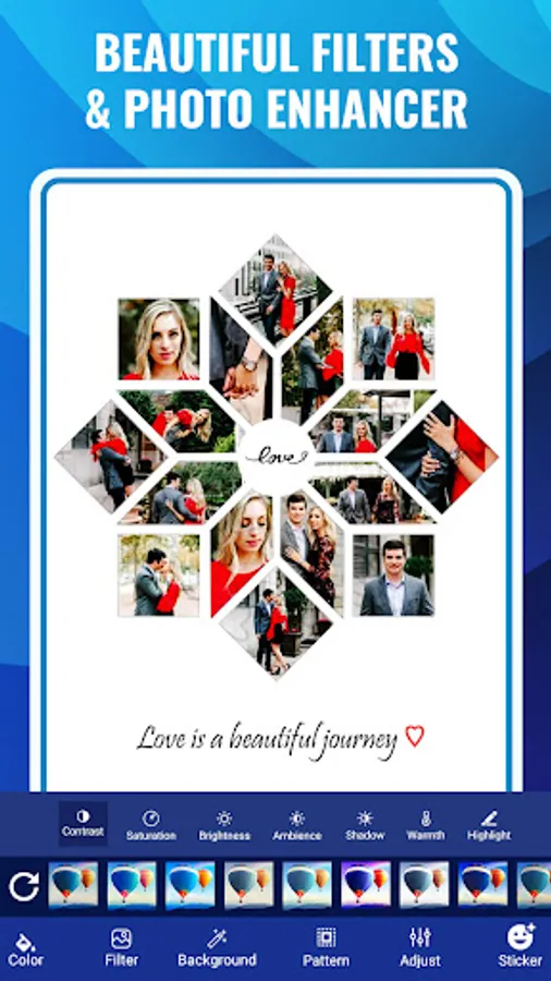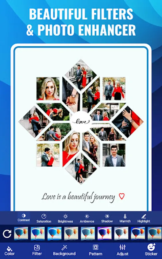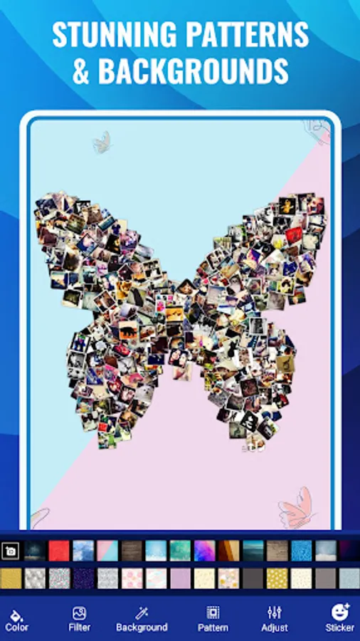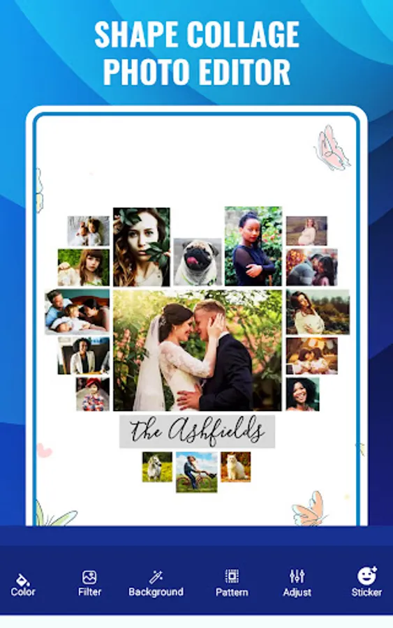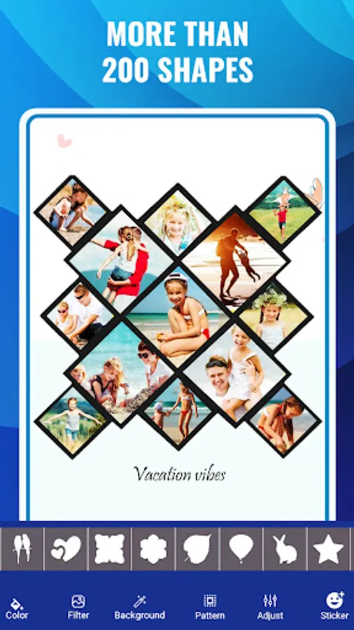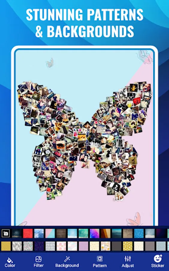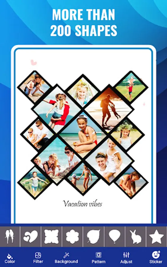 Shape collage photo editor is an automatic photo collage maker that allows you to create collages in different shapes in just few seconds. You can make picture collages in the shape of a heart, birds, apple, butterfly, 100+ shapes. Use Shape collage image editor app to make a beautiful and unique shape collage in any shape. You can also select backgrounds of collage accordingly from 50+ backgrounds for collage.