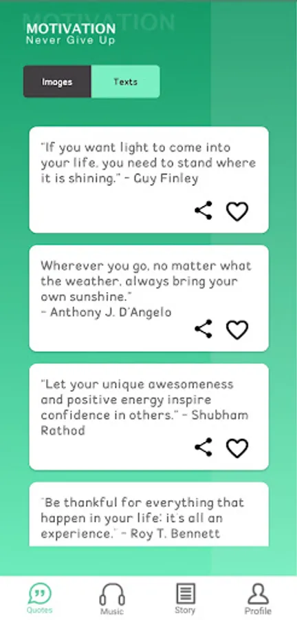 The App provides Motivational Quote images, Text quote with authors, Musics, and stories can lift you UP. And boost your self-confidence.