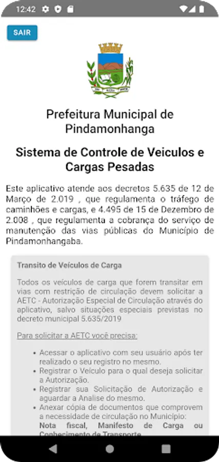 This system complies with Decree 5635 of March 12, 2019, which regulates the traffic of trucks and cargoes in the municipality of Pindamonhangaba. In this system it is possible to register users (driver / responsible), vehicles and management of authorizations. All freight vehicles transiting in the municipality are required to request traffic authorization through this system, except in special situations provided for in the decree provided above.