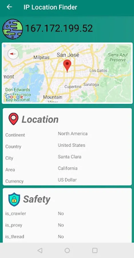 Modern easy-to-use geolocation app that displays the location of an IP address on a map, together with additional useful data such as:
