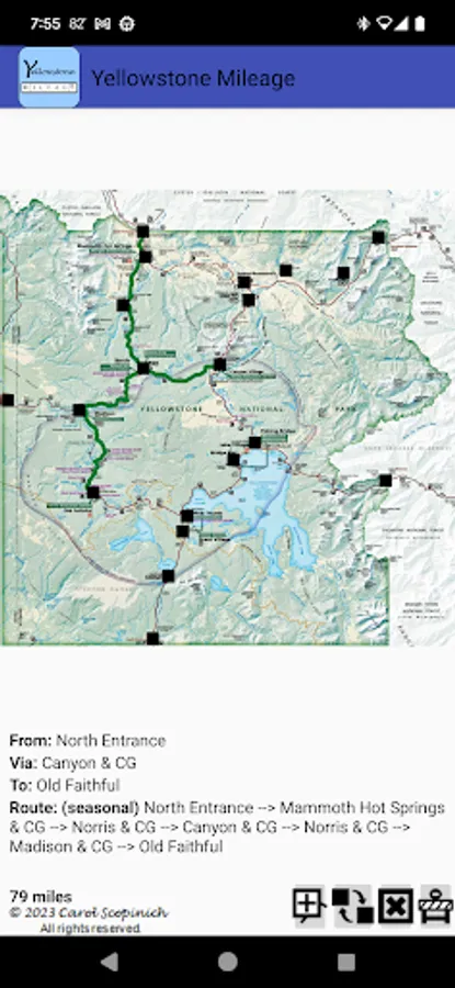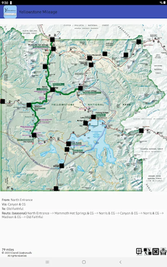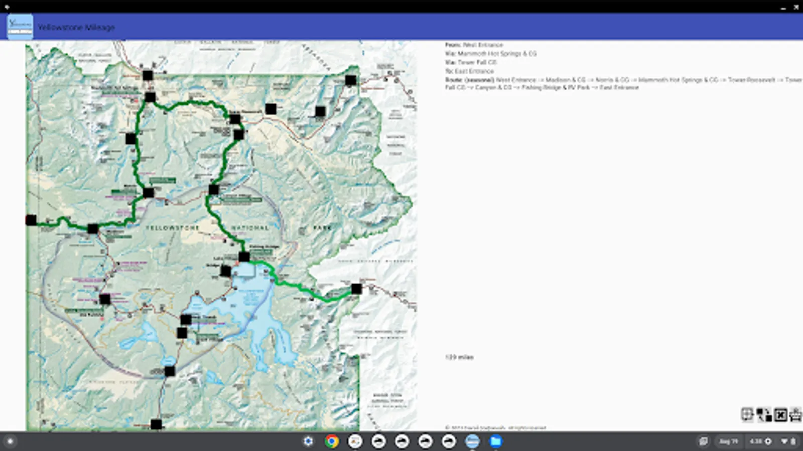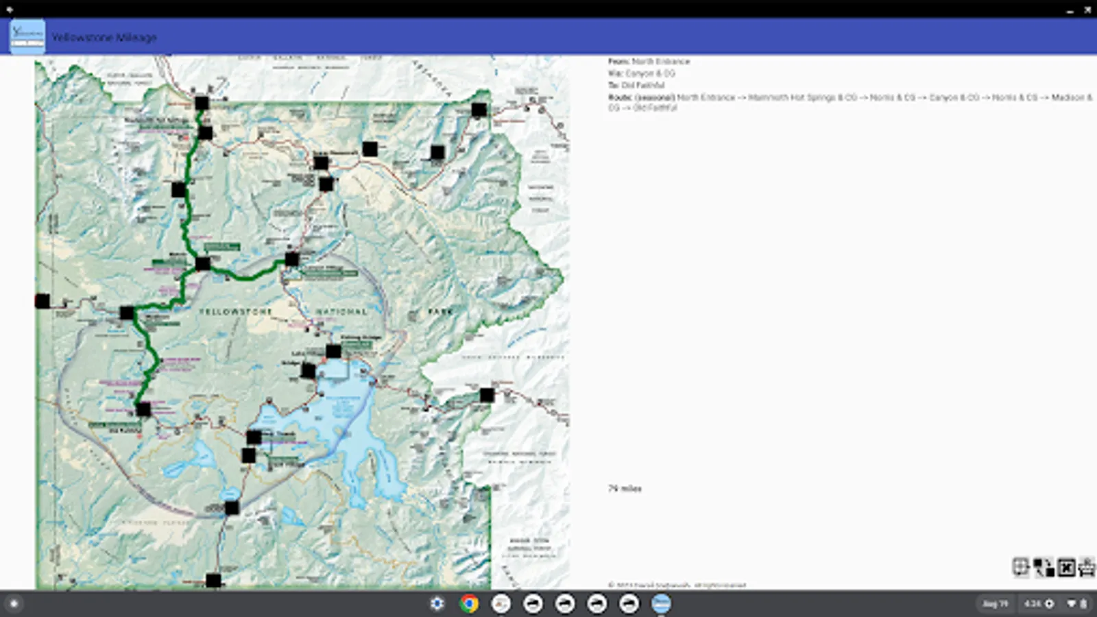 Yellowstone Mileage lets you calculate the shortest route & mileage between 2 end points in Yellowstone National Park (NP). The app is based on the Yellowstone NP map with squares added to indicate user-selectable points. These points are the park entrances, major intersections and campgrounds. You begin by touching one of these squares to select the origination point. Next you touch the square for the destination point. The app calculates the shortest route & mileage between these 2 points. The app highlights the route on the map & shows you the waypoints & mileage from your origination to destination. The app also shows whether the route is open seasonally. To find planned road opening & closing information, you touch the Road Dates button. The app shows you: