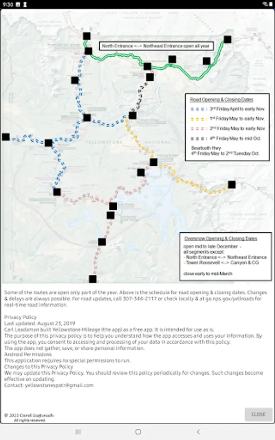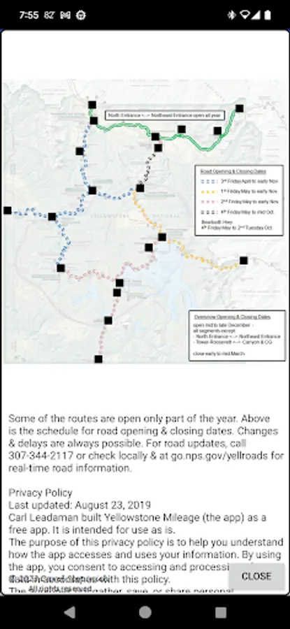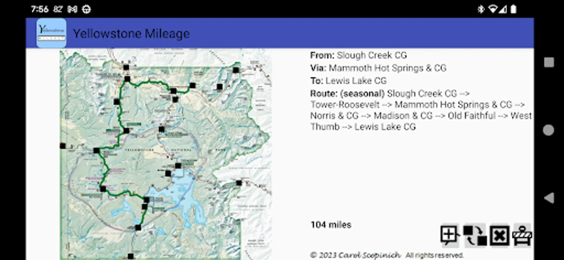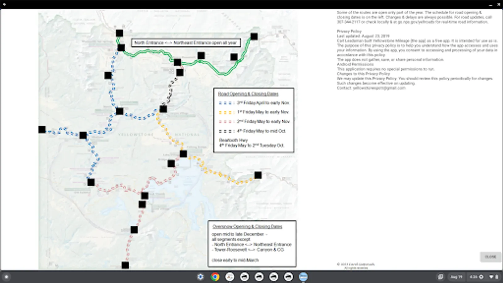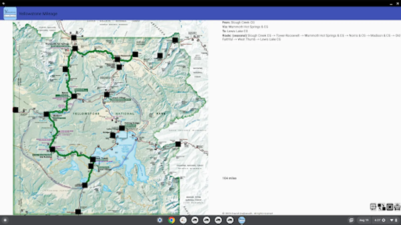 Yellowstone Mileage lets you calculate the shortest route & mileage between 2 end points in Yellowstone National Park (NP). The app is based on the Yellowstone NP map with squares added to indicate user-selectable points. These points are the park entrances, major intersections and campgrounds. You begin by touching one of these squares to select the origination point. Next you touch the square for the destination point. The app calculates the shortest route & mileage between these 2 points. The app highlights the route on the map & shows you the waypoints & mileage from your origination to destination. The app also shows whether the route is open seasonally. To find planned road opening & closing information, you touch the Road Dates button. The app shows you: