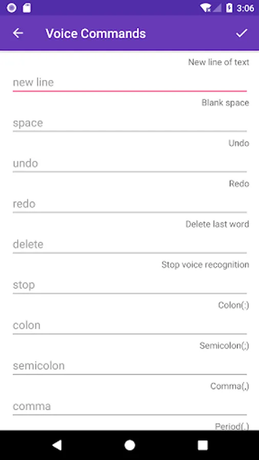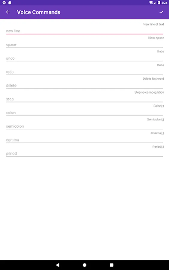 - Configurable voice commands for creating and editing your notes (For instance there is a command for adding a blank space or for adding a new line of text).