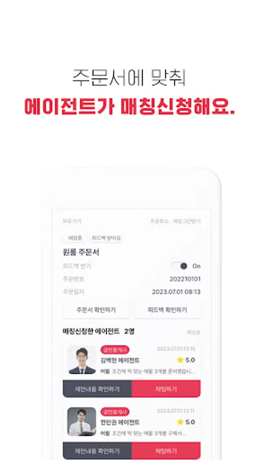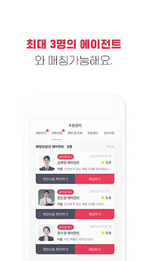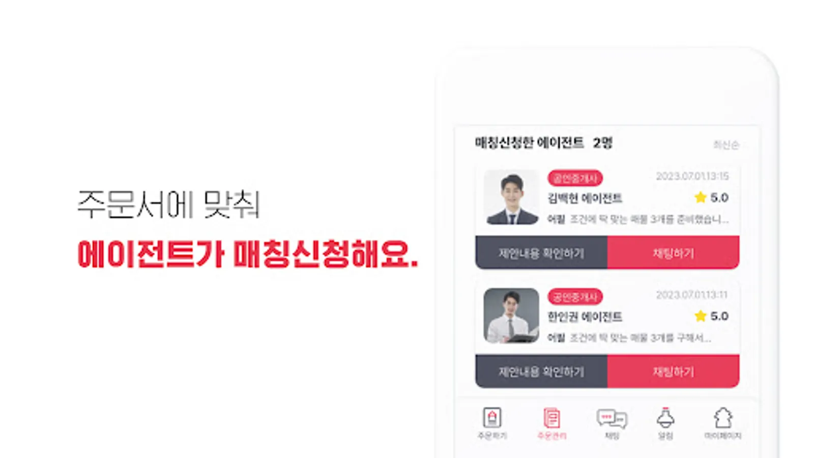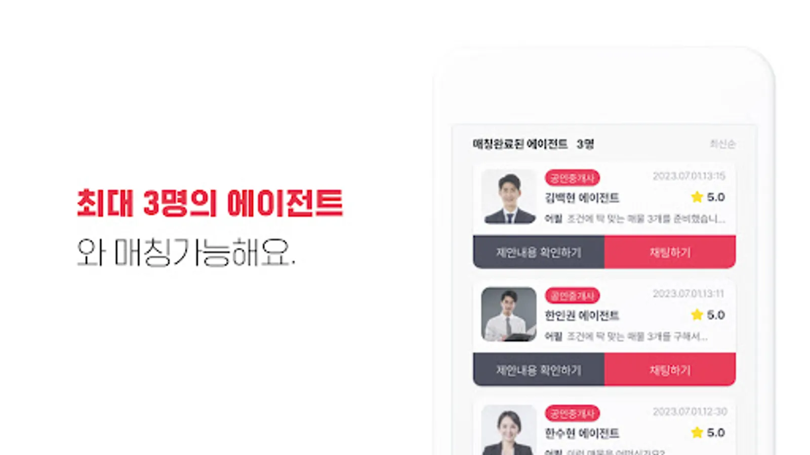 02. You can meet up to 3 agents (professional brokers). After viewing the profile of the agent who applied for matching, accept the matching and you're done! Get offers only for the conditions you want. If you don't want to, you can decline and stop.