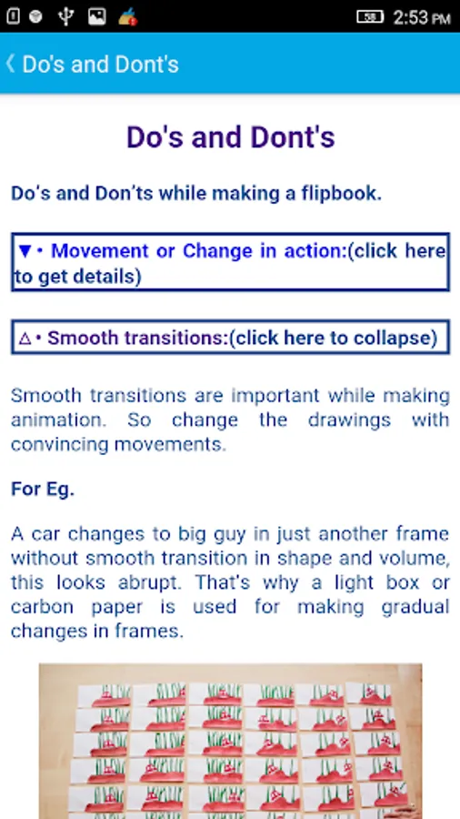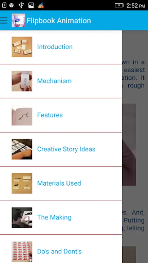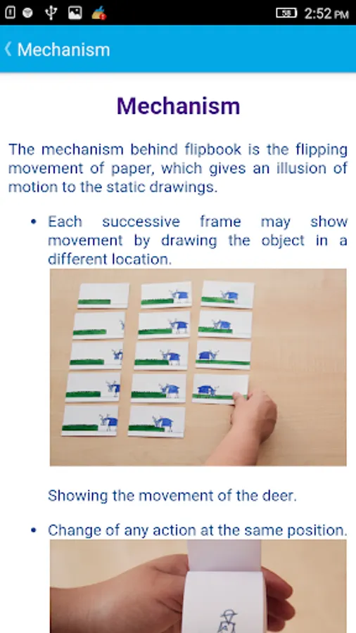 This mobile app provides information about flipbook animation. Flip book is a bundle of drawings drawn in a movement on the paper.