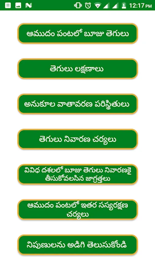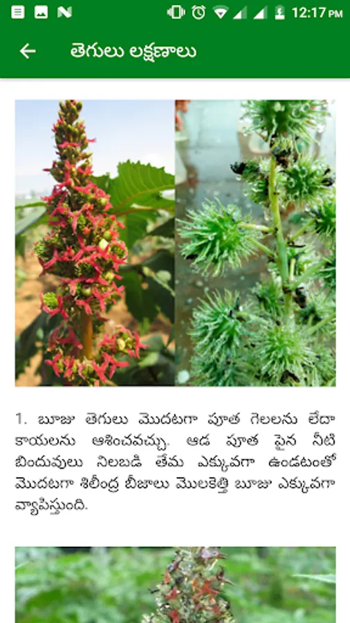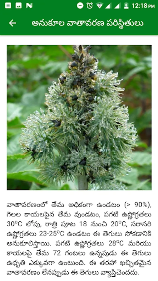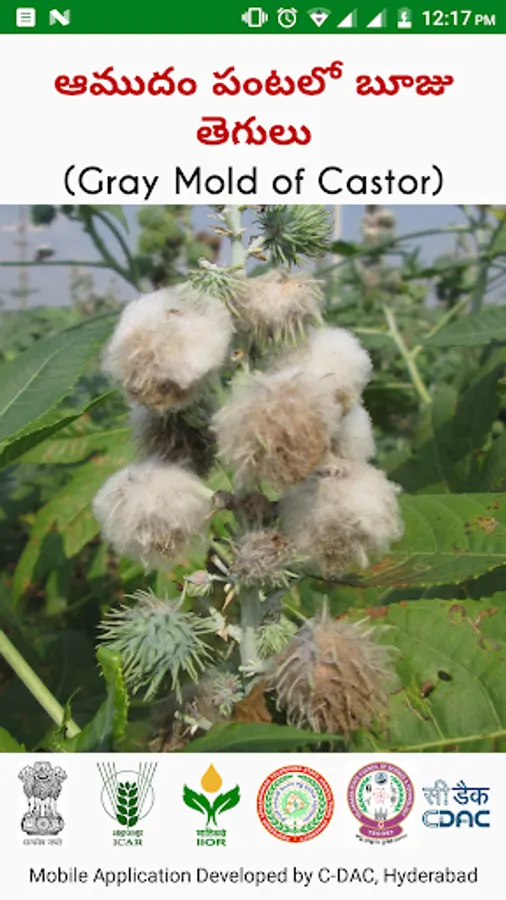 An app on gray mold disease of castor in Telugu was developed by ICAR-Indian Institute of Oilseeds Research, Rajendranagar, Hyderabad for the benefit of castor growing farmers of Telangana and Andhra Pradesh. The app provides general information on castor gray mold, disease symptoms, favourable weather conditions, control measures, proactive measures to be taken at various crop stages against castor gray mold apart from information on management of other pests and diseases. There is also an interactive expert advisory system provided which can be used by the farmers to know about the chances of disease occurrence and spread based on prevailing weather at particular point of time and measures to be taken to control the disease.