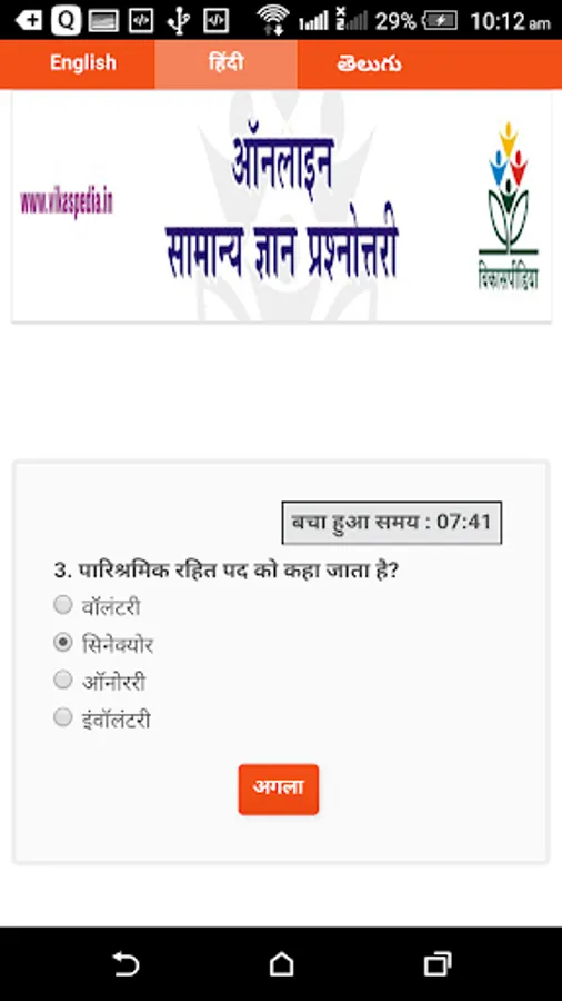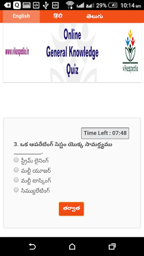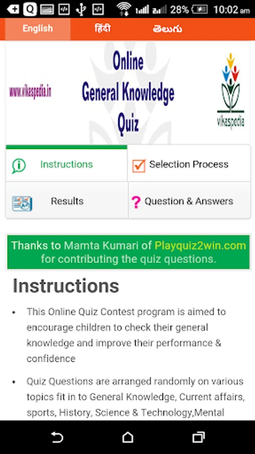 Quiz is presently availabe in three indian languages English,Hindi and Telugu.