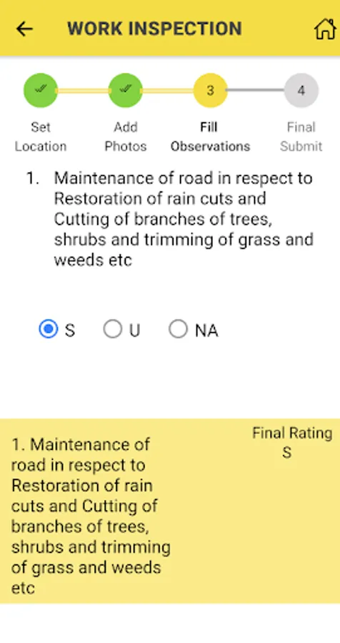 All the inspections conducted by Quality Monitors are recorded through this mobile app along with recording of geo-tagged photographs and quality monitoring observations, which are then uploaded on OMMAS. Every independent monitor is required to grade the quality of every item and sub-item of road work and based on grading of various items and sub-items of work, overall quality Grading would be generated as per guidelines. The work generally conforming to specifications would be graded “Satisfactory” (S) and work which generally doesn’t conform to specifications would be graded “Unsatisfactory”, however, if a work needs some improvement to conform to specifications it would be graded as Satisfactory Requiring Improvement” (SRI).
