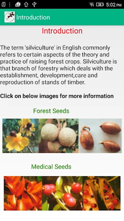 This app provides information related to forest seeds and medical seeds. The term silviculture in English commonly refers to certain aspects of the theory and practice of raising forest crops. Silviculture is that branch of forestry which deals with the establishment, development, care and reproduction of stands of timber.