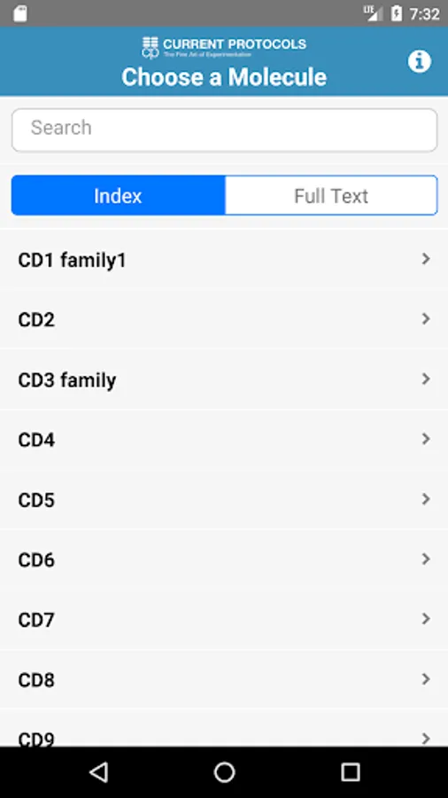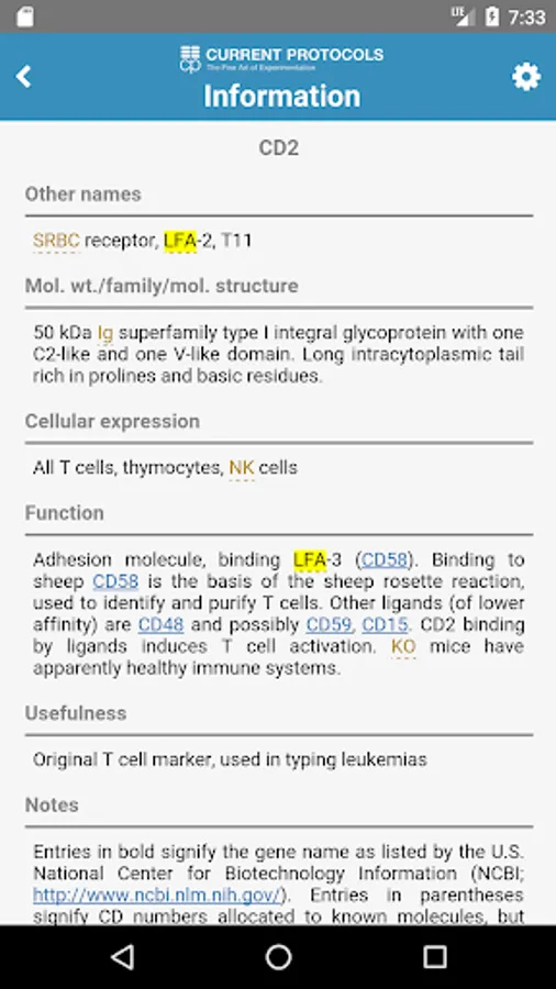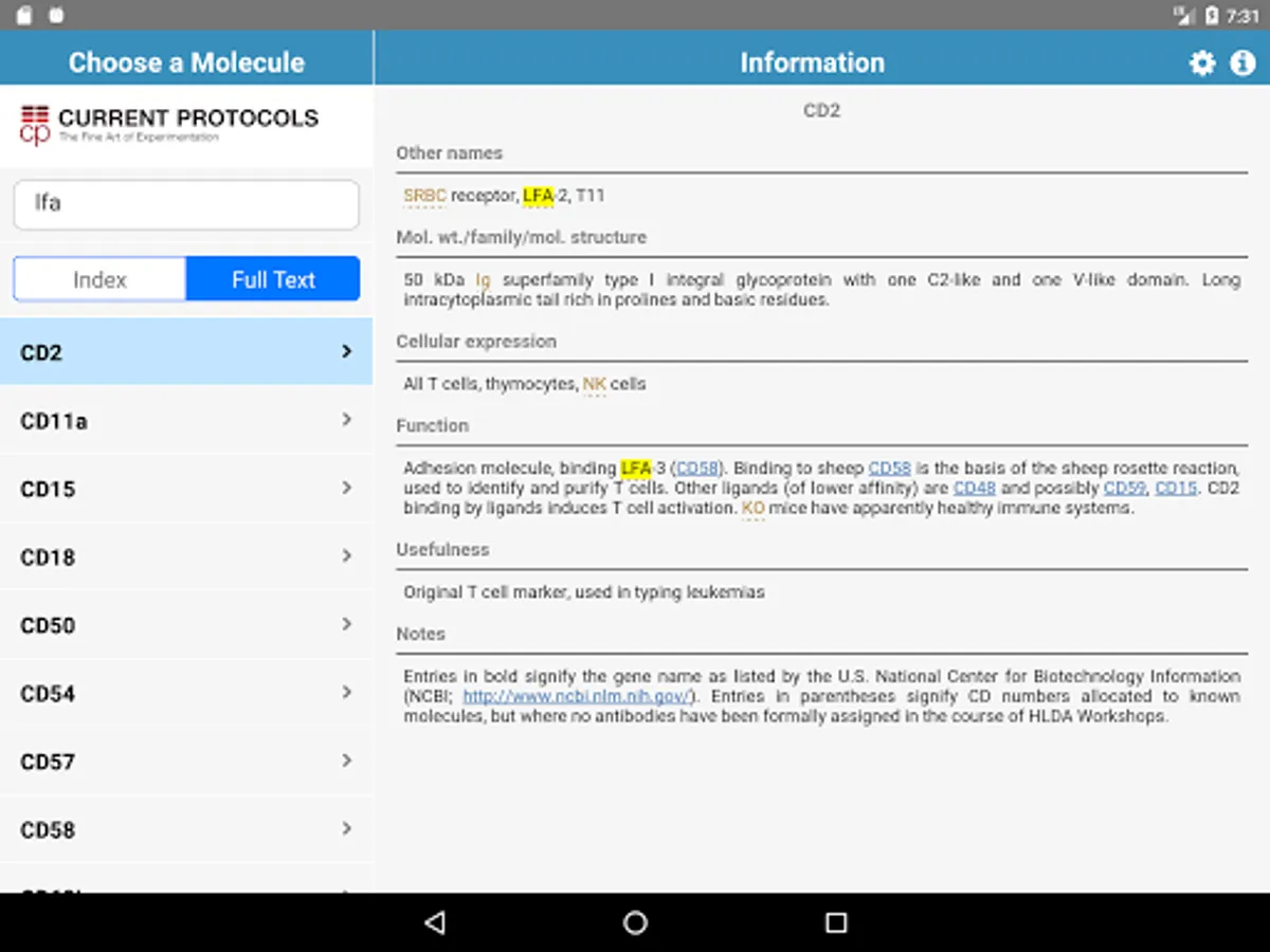 CD molecules are cell-surface antigens identifiable by their reactions with specific monoclonal antibodies, which represent an important system for identifying and differentiating human cells. The CD Antigen Information Finder was adapted from Current Protocols in Immunology (Beare, et al., 2008. Monoclonal Antibodies to Human Cell Surface Antigens. Curr. Protoc. Immunology. 80:A.4A.1–A.4A.73) and includes data on the molecular weight, family, molecular structure, cellular expression patterns, function, and biomedical usefulness of the molecule. The database is searchable by the official CD designation of the antigen as well as by synonyms and other keywords including associated diseases and tissue/organ names.