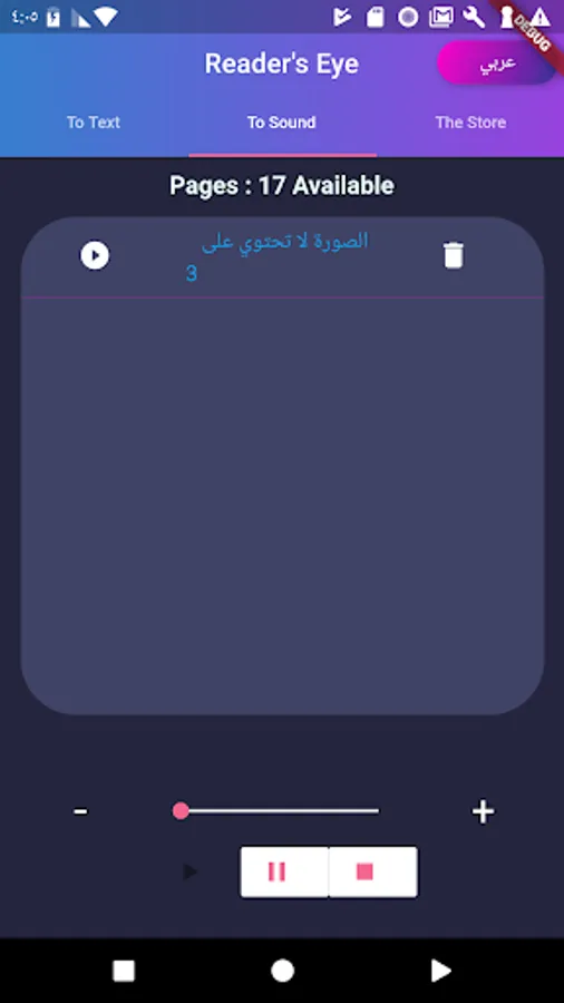You can share text files to other applications. When playing audio files you can control the speed of the reader through the speed indicator.