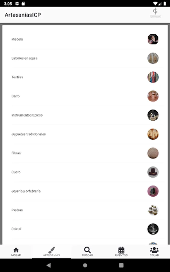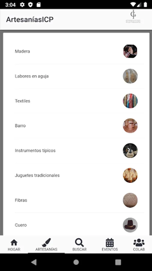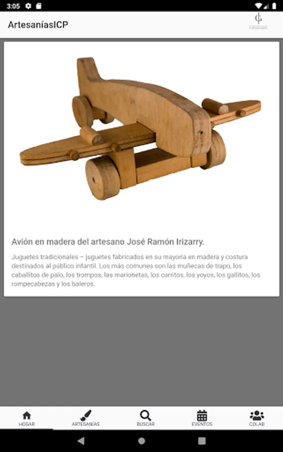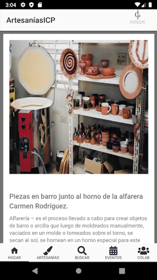 This application presents information about artisan work in Puerto Rico, as well as the artisans of Puerto Rico. It aims to put the public in contact with artisans while educating about artisan work. It is part of the effort of the Institute of Puerto Rican Culture (ICP) to expand the sales platforms of the artisan sector in Puerto Rico. This application was created by the students of the University of Puerto Rico, Carlos J Díaz Vargas, Lyxaira Glass Rivera, Christian J Matos Rivera and Emmanuel Rivera Colón who began to develop it as part of the Software Engineering course taught by Dr. Carlos J Corrada Bravo in the Río Piedras Campus.