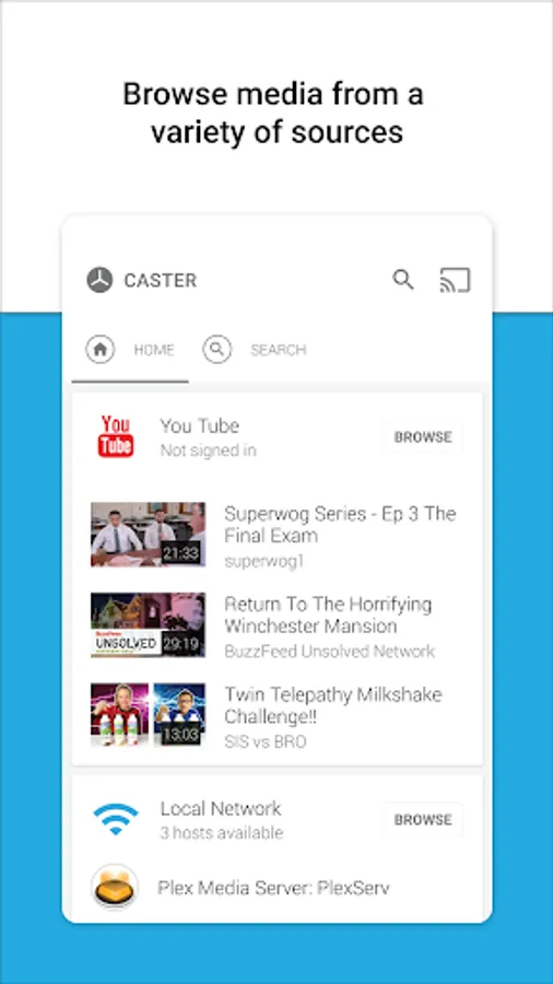 Caster is an aggregated media client designed for easy browsing and playback both locally and on Chromecast devices.