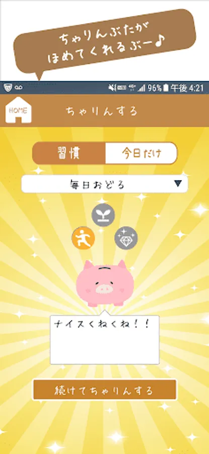 また、実行するとちゃりんぶたが「おほめの言葉」を言ってくれるので、小さなお子様から大人まで楽しみながら実践することができます。